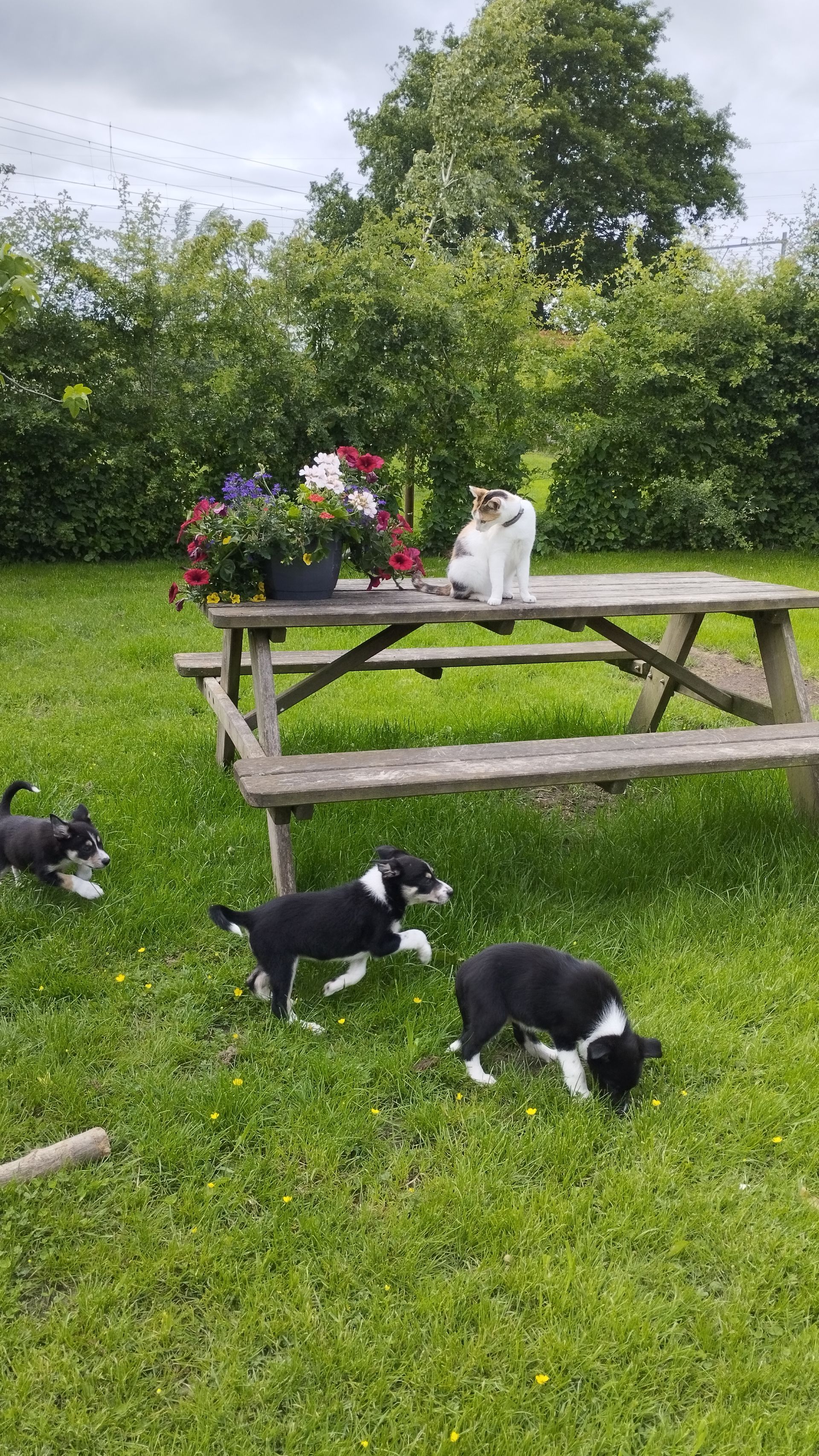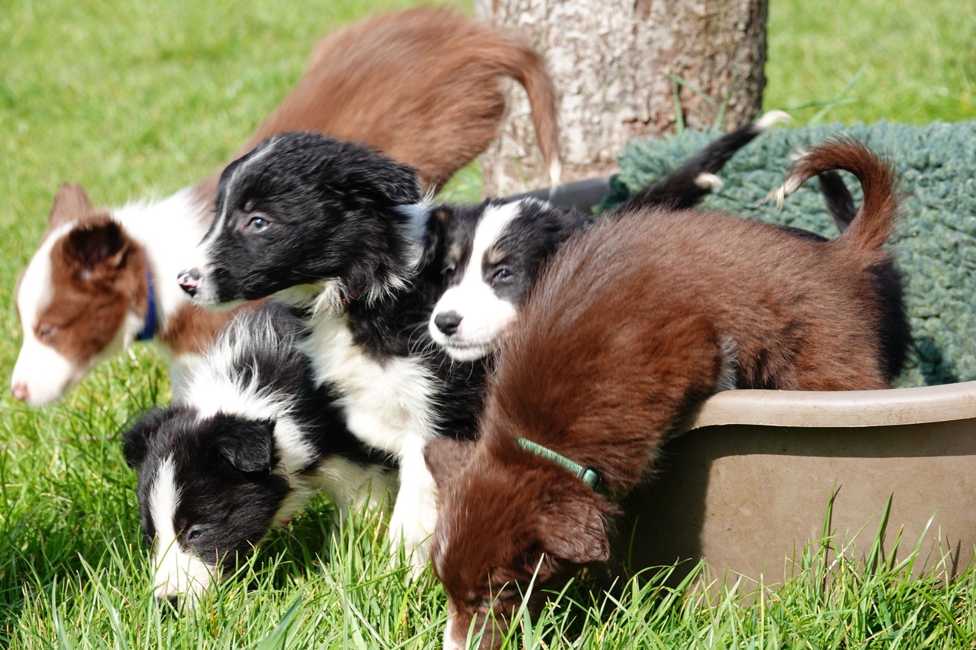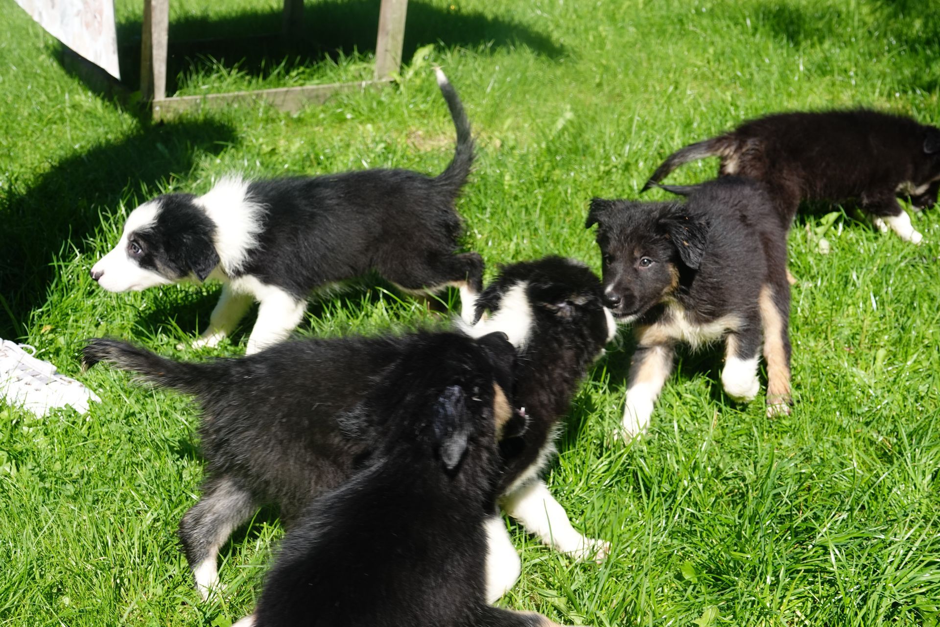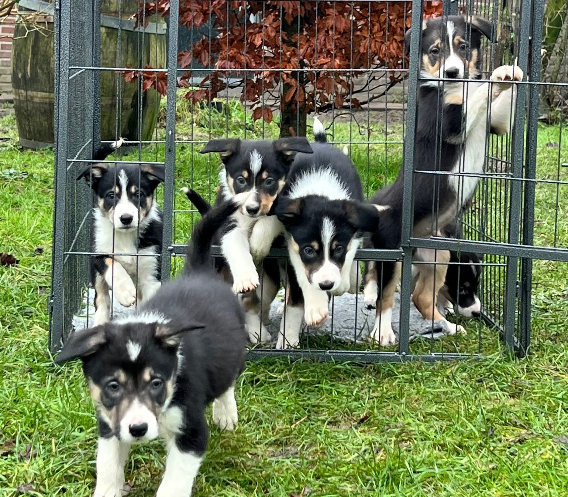 Dit zijn de pups van Dubh X Panda. Zij zijn in februari 2022 geboren. Op de foto zijn ze 8 weken oud.We hebben zelf 1 pup uit dit nest aangehouden en daar hebben we geen spijt van. Een lieve hond en ze laat ook nog eens mooie dingen zien bij het werken met schapen. Ook de andere vier gaan goed.